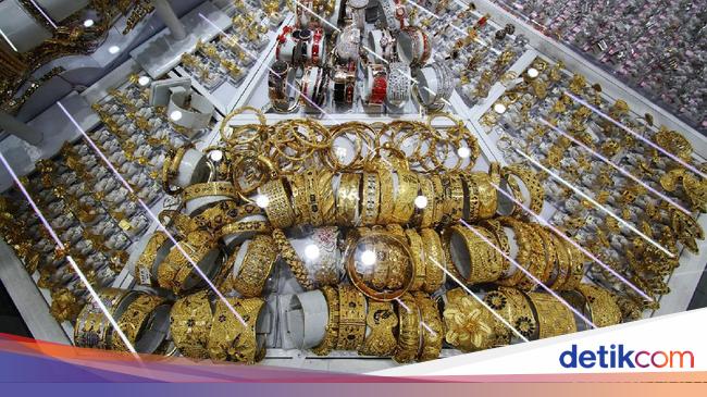 Harga Emas Hari Ini - Pedagang memperlihatkan gelang emas di tokonya di Jalan Tgk Chik Pante Kulu Banda Aceh Selasa 1852021. Sementara emas satuan terkecil dengan ukuran 05 gram dijual Rp521000 juga terpantau turun Rp500 dari harga.